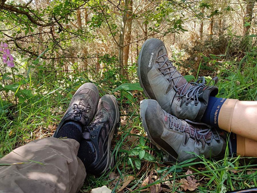 Pilgerpause im Wald – zwei Wanderer ruhen sich aus, die Schuhe erzählen vom Weg.
